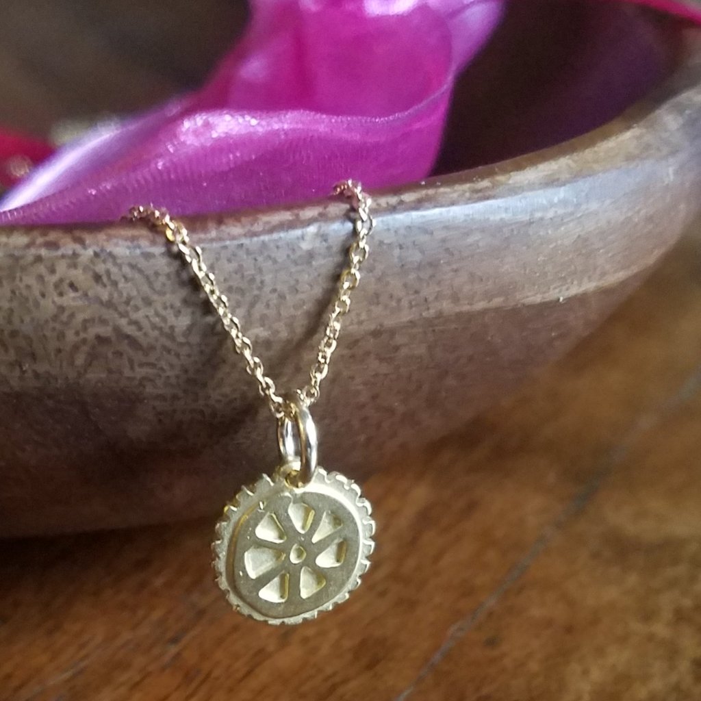 Express your passion for cycling and encourage others to ride with the Cycling Chicks elegant Mini Gold Wheel Necklace.