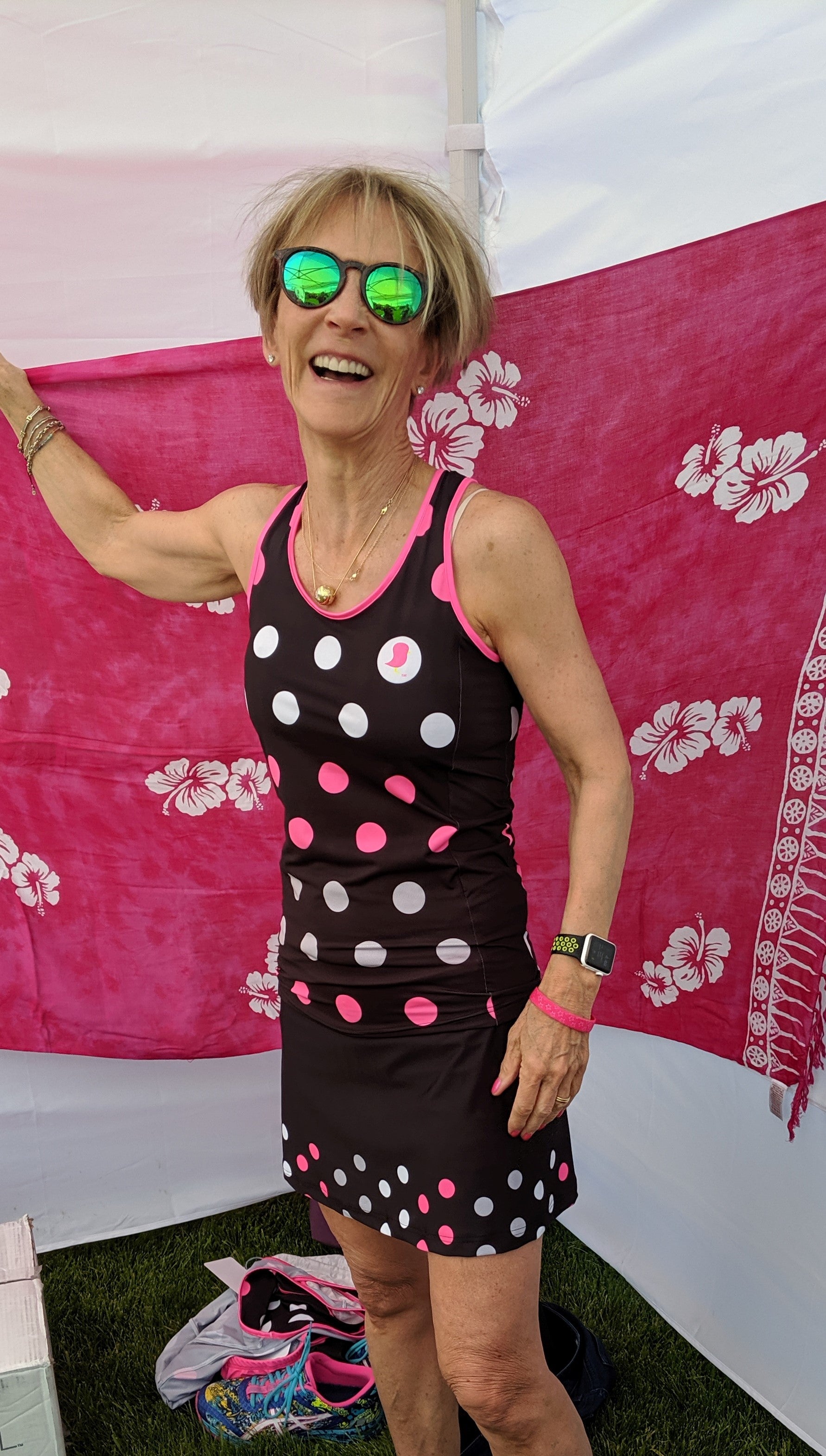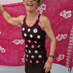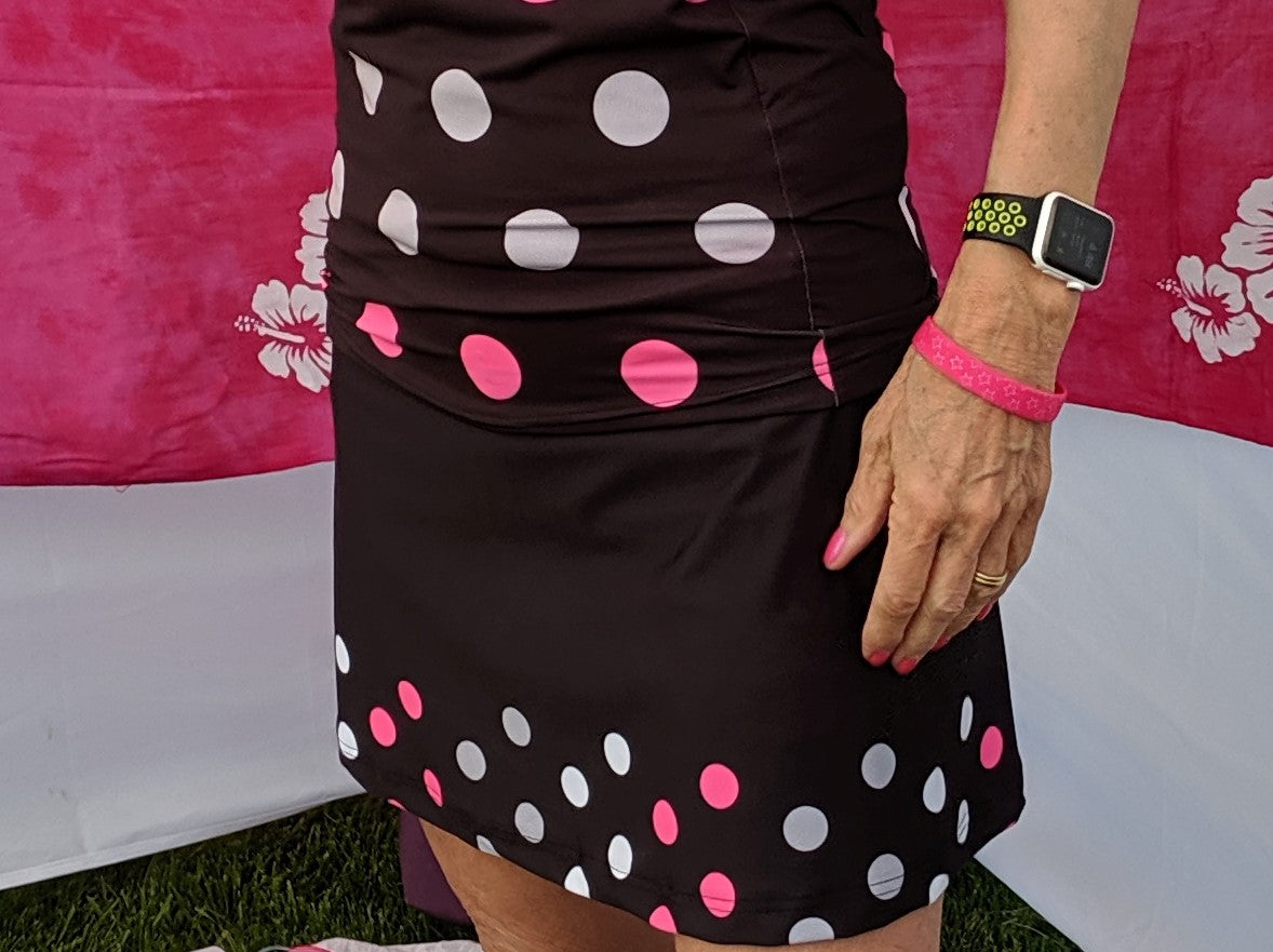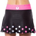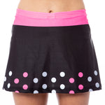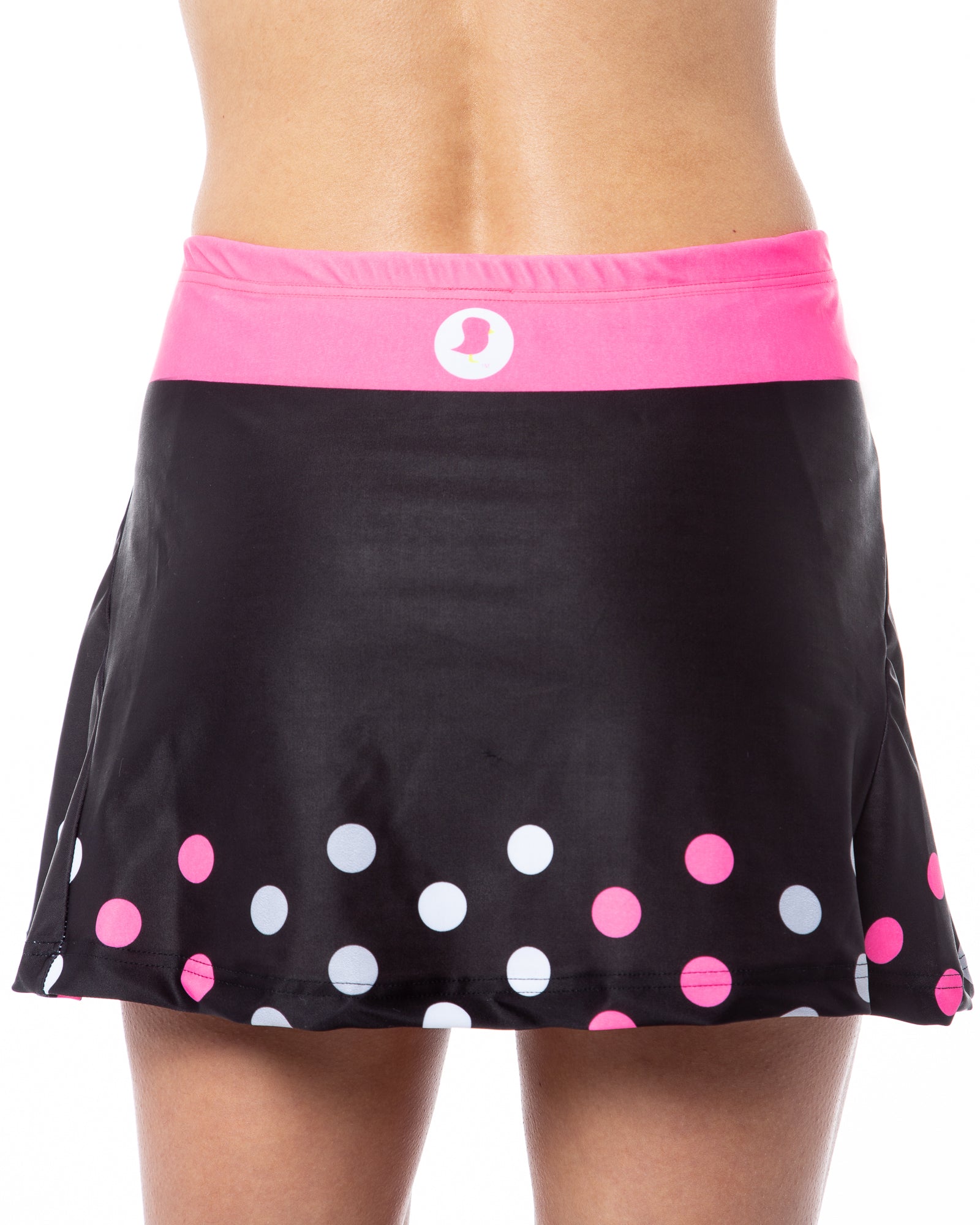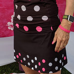 Our Polka Dot Runner Chick skort is a gem.  Soft, lightweight, wicking fabric is so gentle on your skin, you might feel like you are running bare naked, it's that comfy.  We are combining a super soft Italian technical fabric for our tank top and skort.